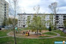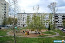Во дворе новая детская площадка, за домом школа N13 и детские сады 214 и 260.