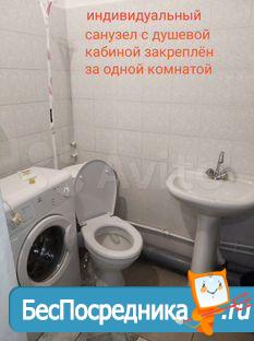 индивидуальный санузел с душевой кабиной, унитазом, раковиной и стиральной машиной напротив комнаты, закрывается на ключ, закреплён только за этой комнатой.