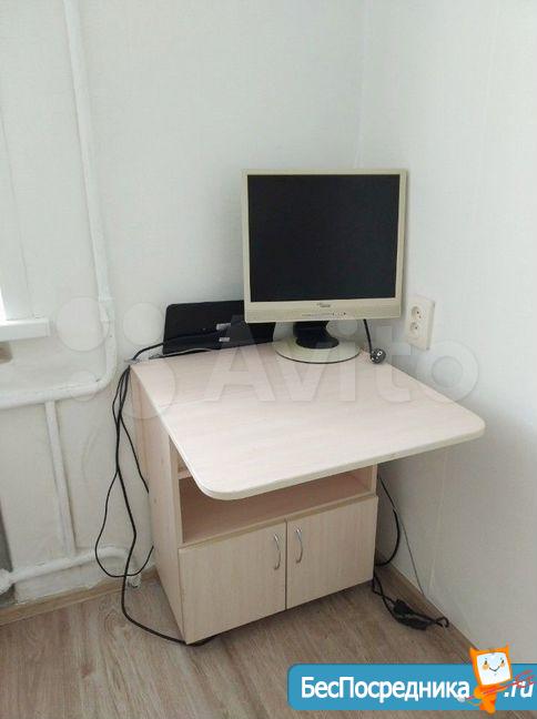 в комнате имеется кухонный уголок с раковиной и подводом воды, холодильник, микроволновка, стол и стулья, а также диван, компьютерный столик, шкаф.