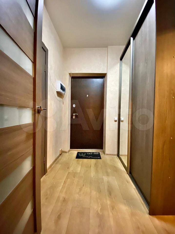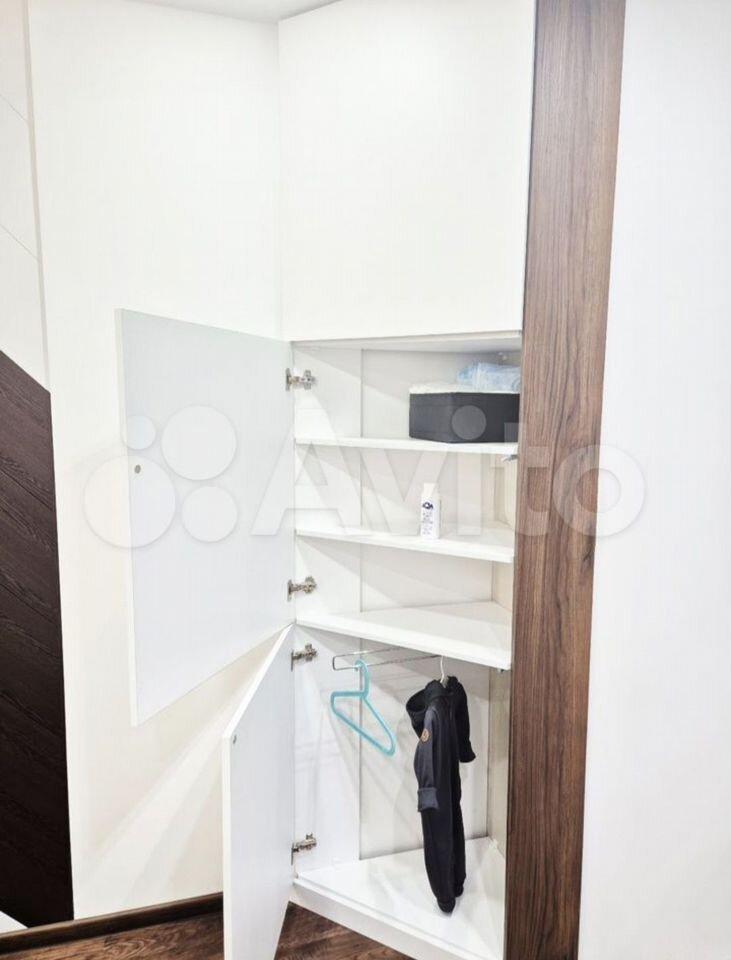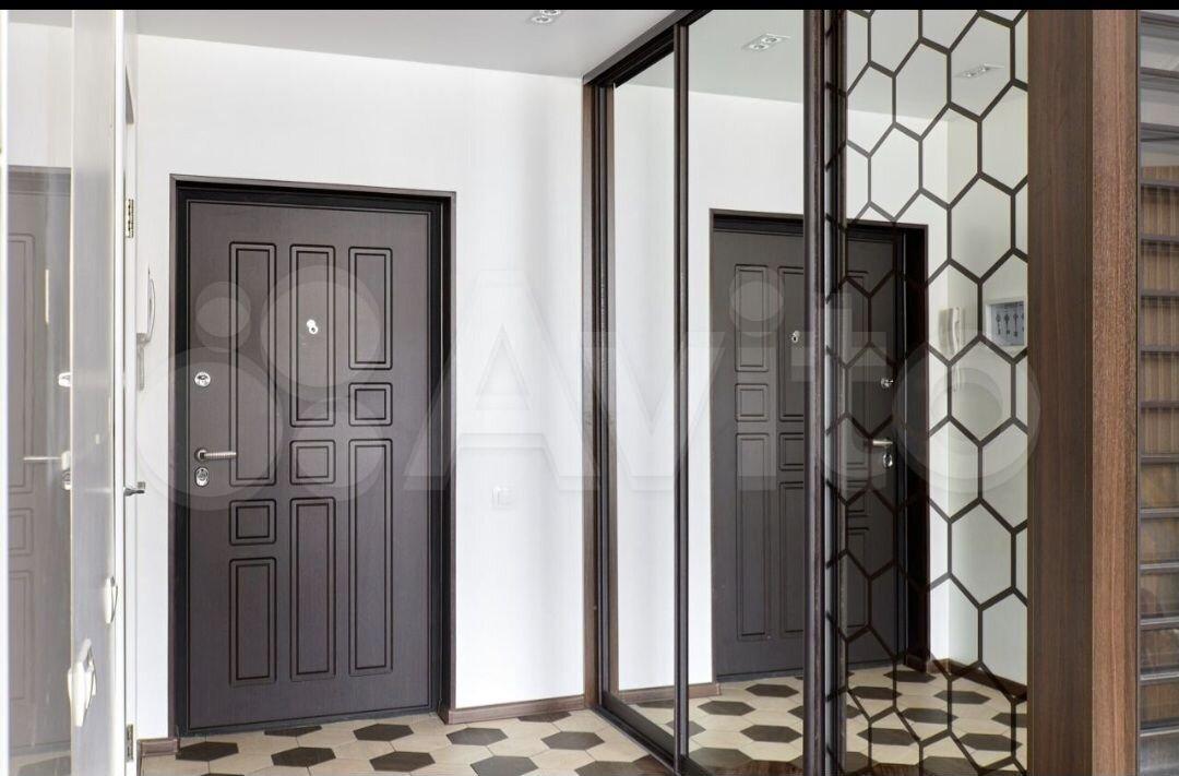 В коридоре большой встроенный шкаф с дверцами шкаф-купе(с отдельным глубоким комодом и штангой), с толстой плотной входной дверью не пропускающей внешний шум.