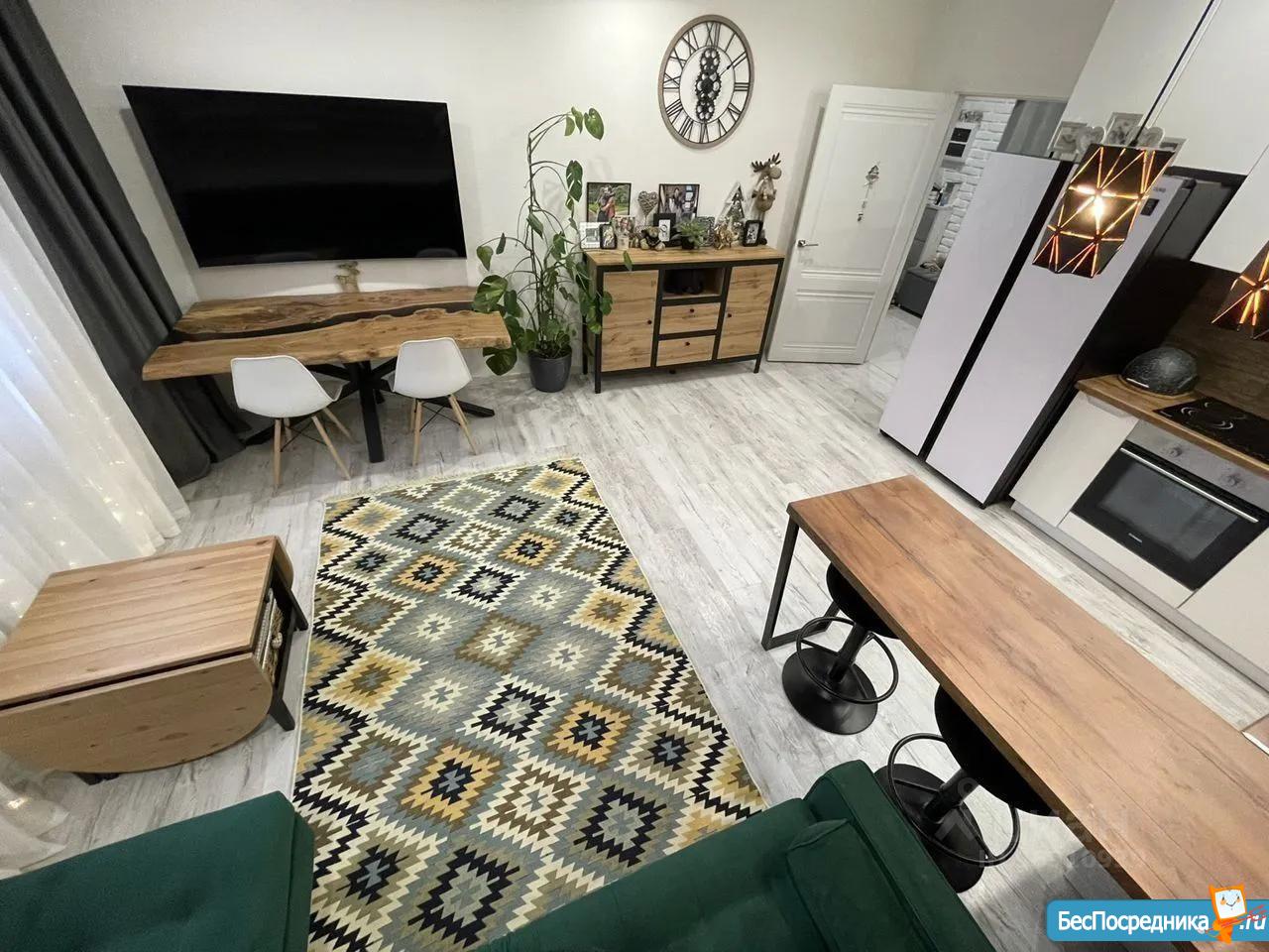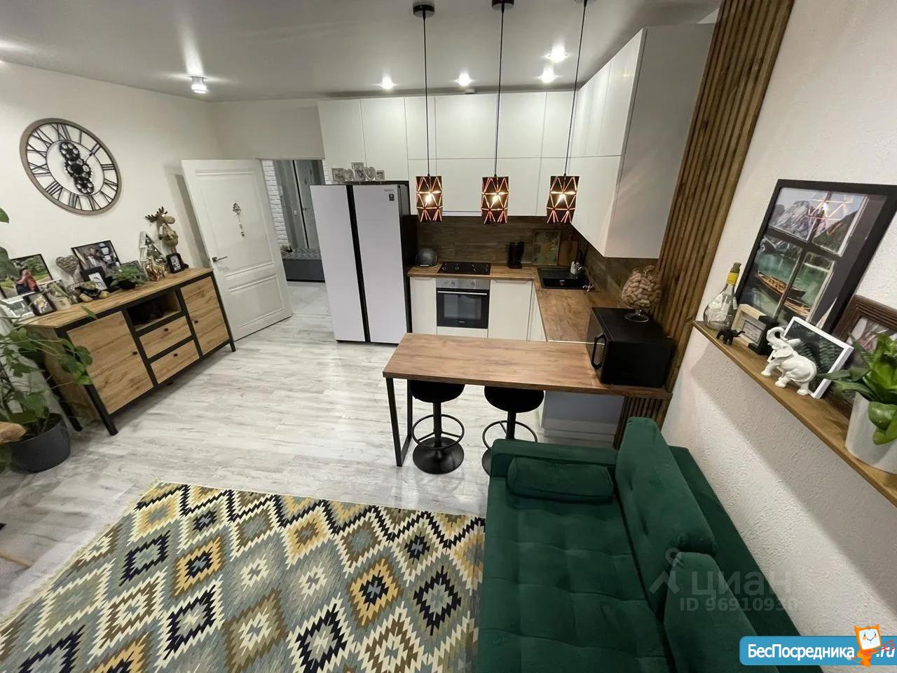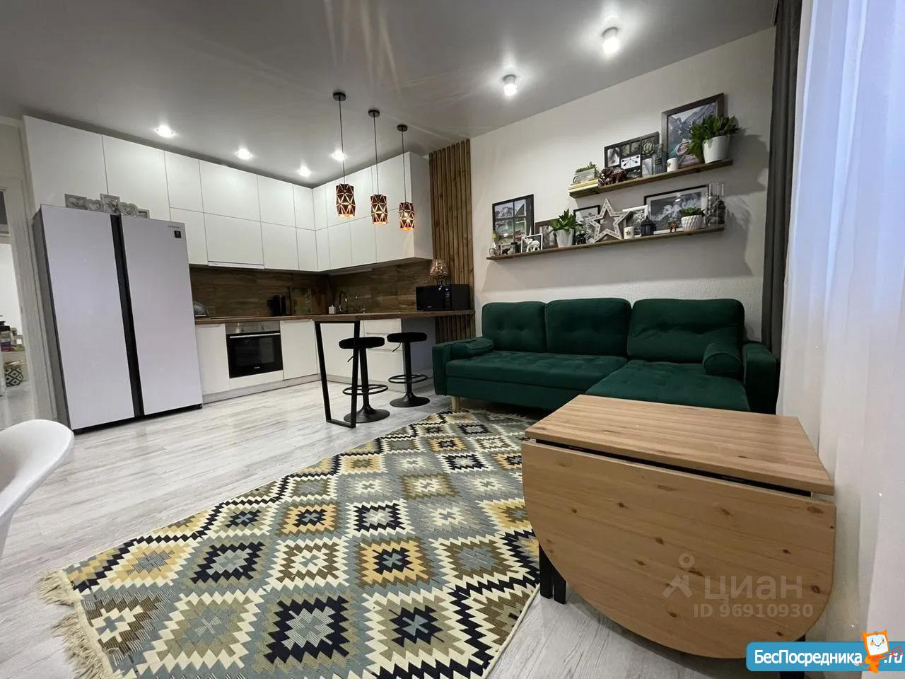 *Гостиная объеденная с кухней с большим зеркальным шкаф-купе, диван и обеденная зона, телевизор.