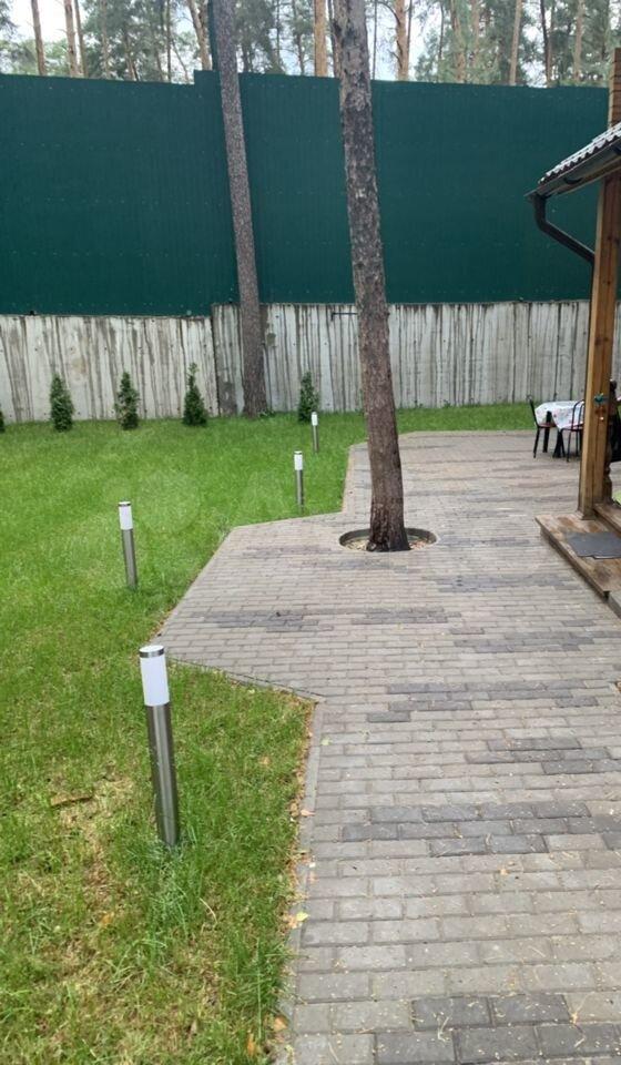 По территории участка брусчатка, после уличных столбиков освещения идёт зелёный газон, вдоль забора туи.