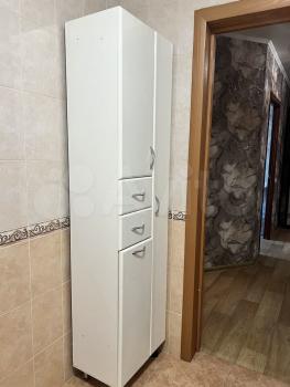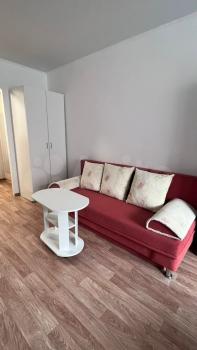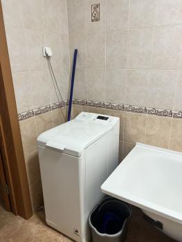 Есть раскладной диван, большой шкаф с комодом, стиральная машина, микроволновка, плита, телевизор, утюг, гладильная и сушильная доска.