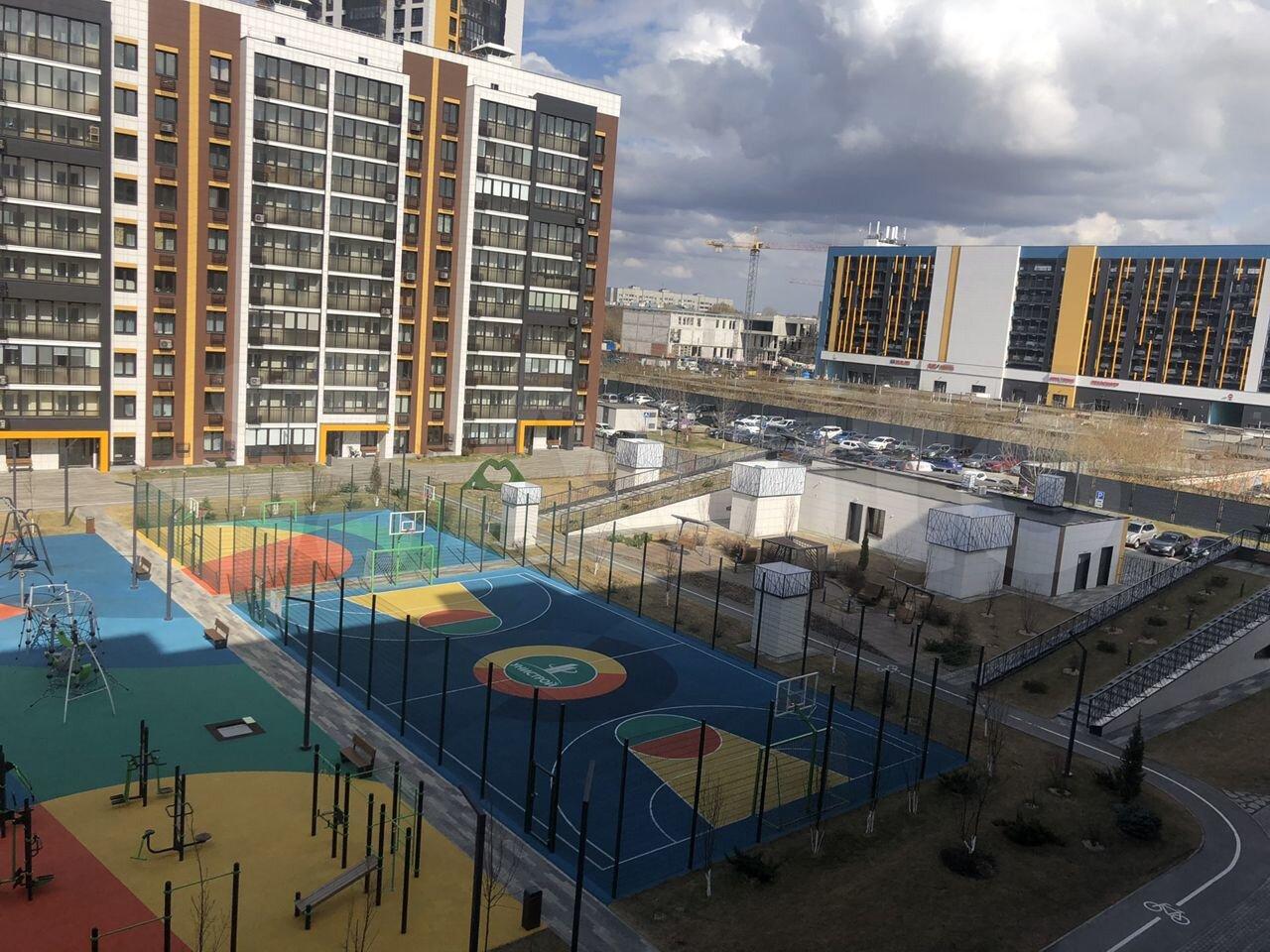 В доме колясочная, удобный подъезд, обустроенный огороженный двор со спортплощадкой, велодорожкой, арт-объектами и т.д.