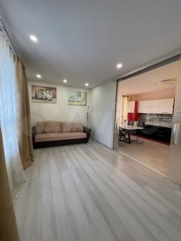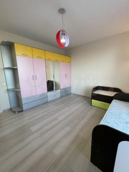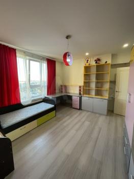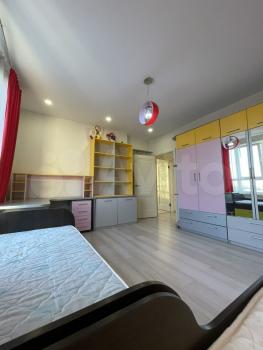 В квартире сделан полноценный ремонт. Лоджия. Кухонный гарнитур, диван, кровать, детская мебель, шкафы, стол, стулья.