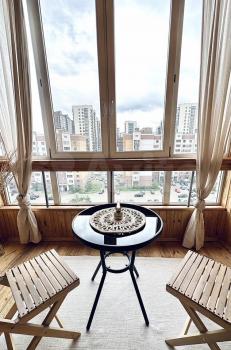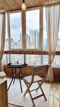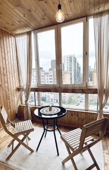 Чистая квартира и большой обшитый деревом балкон с прекрасным видом на детскую площадку и удобную стоянку.