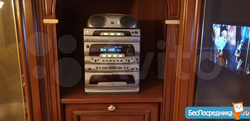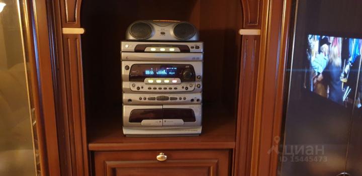 В гостиной из мебели имеются раскладной диван (французская раскладушка), два кресла, итальянская стенка с местами для хранения, тумба с телевизором Samsung (50") и Blu-Ray плеером, стол-книжка для приёма гостей, журнальный столик. Музыкальный центр соединён с телевизором.