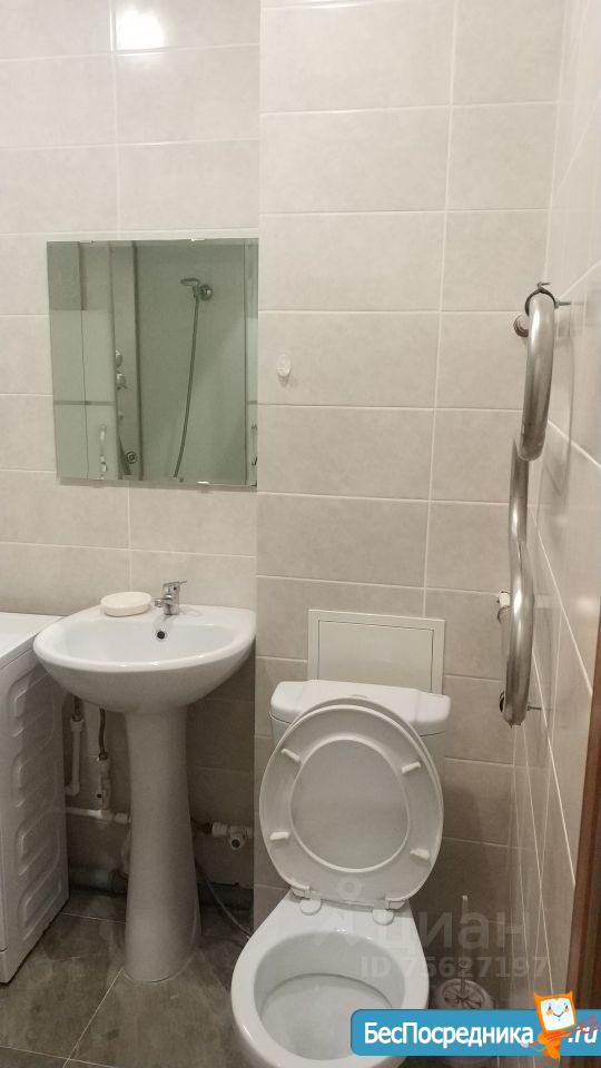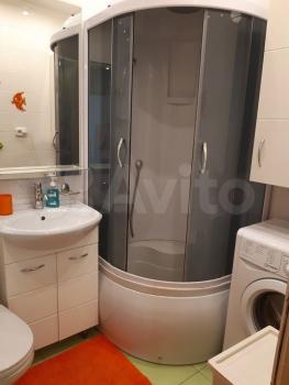 Кухня оборудована всем необходимым: холодильник, плита, микроволновая печь и стиральная машина. Из мебели — вместительные шкафы. Санузел совмещенный, оформлен в современном стиле.
