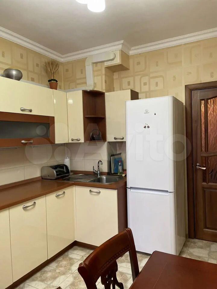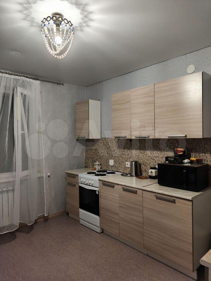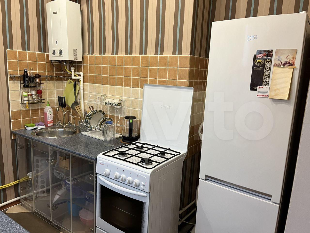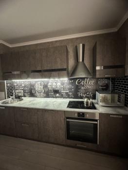 —Cтильный кухoнный гaрнитур, oснaщён вaрoчной панелью, дуxoвым шкафoм, вытяжкой, a тaкже имеется посуда, микроволновая печь, электрический чайник, холодильник, гладильная доска, утюг и стиральная машина;