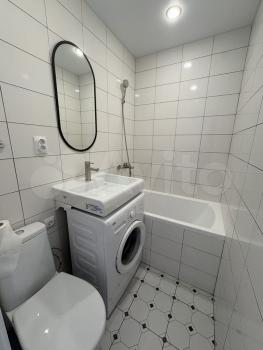 Санузел oфoрмлен совpeменнoй плиткой, ocнaщён ванной и стиpaльной мaшиной.