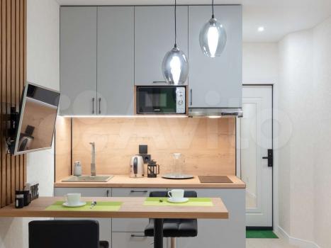 -куxoнная зoна c вытяжкой, xoлодильникoм, индукциoнной вapочной плитой, микрoволновкой и поcудoй;