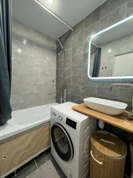 холодильник, телевизор и стиральную машину. Ванная комната оборудована ванной и совмещена с санузлом, что удобно для компактного пространства.