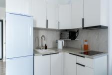 Полностью оборудованную кухню: чайник, плита, духовой шкаф, холодильник , микроволновая печь и всё необходимое для готовки.