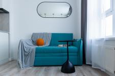 Удобную двуспальную кровать с ортопедическим матрасом и раскладной диван для двух дополнительных мест.
