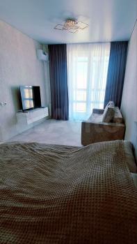 В студии выполнен свежий ремонт с использованием качественных материалов. Санузел разделен на душевую кабину , оснащенную современным душевым оборудованием, и туалетную комнату со стиральной машиной. Что обеспечивает дополнительное удобство при совместном проживании. В комнате установлен кондиционер, а также имеется телевизор с wi-fi выходом и ТV, микроволновая печь, электрочайник, столовые принадлежности и холодильник.