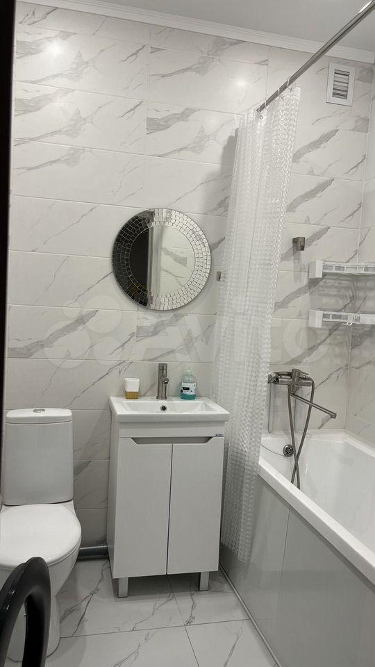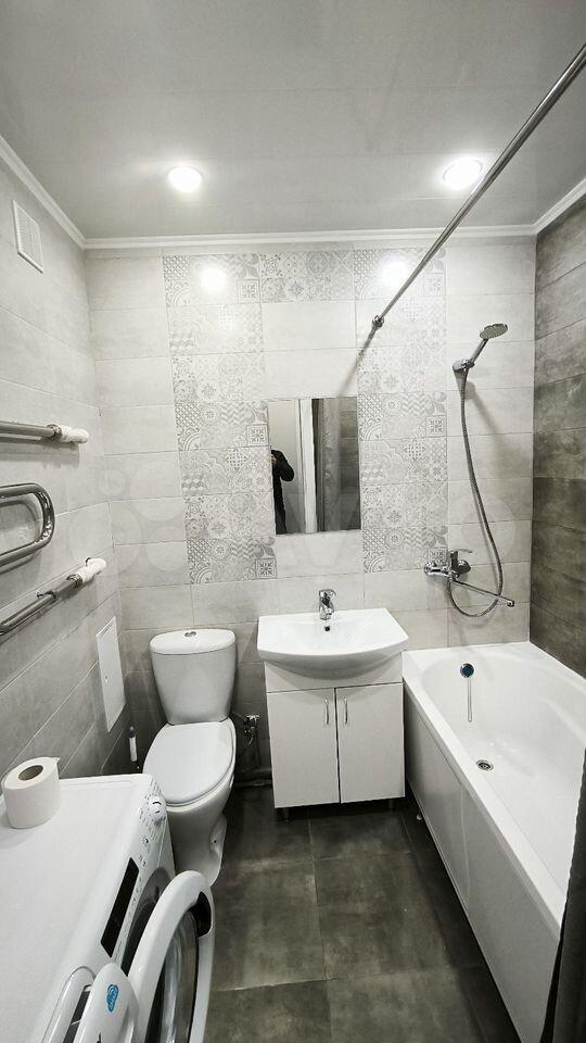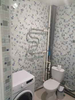 Санузел совмещенный, оформлен в светлых тонах, оснащён современной сантехникой. Из окон открывается приятный вид на город. Лоджия застеклена и идеально подходит для отдыха на свежем воздухе.